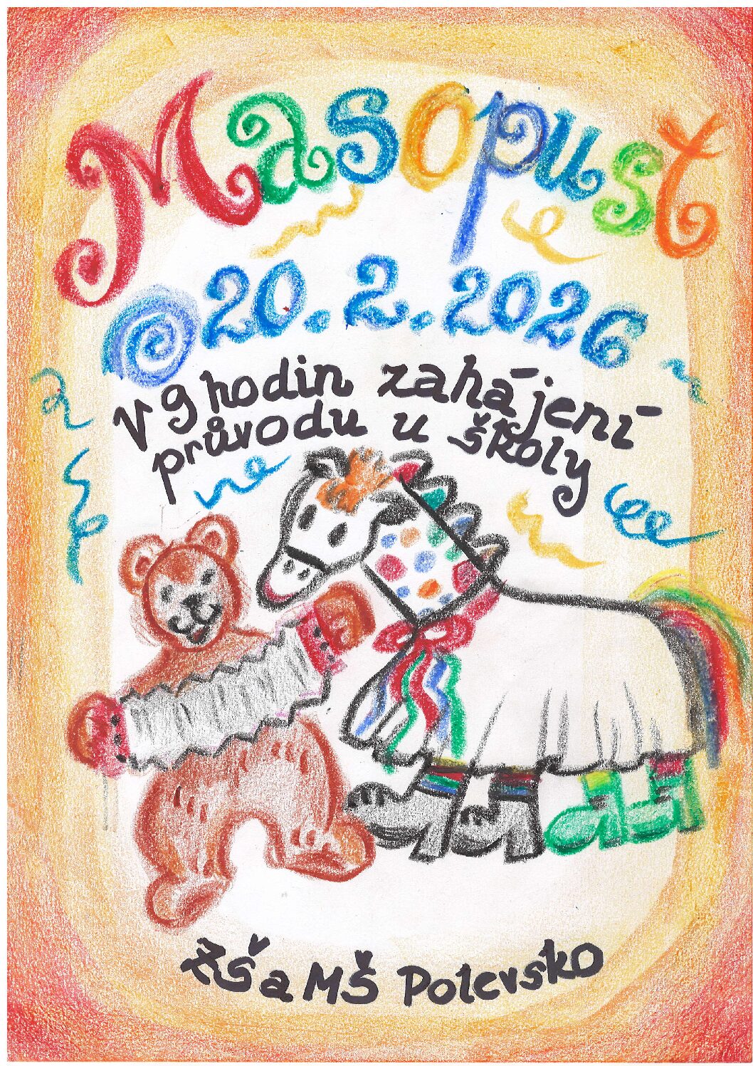 Srdečně zveme všechny děti, rodiče i přátele školy na veselý masopustní průvod plný masek, barev, písniček a dobré nálady.