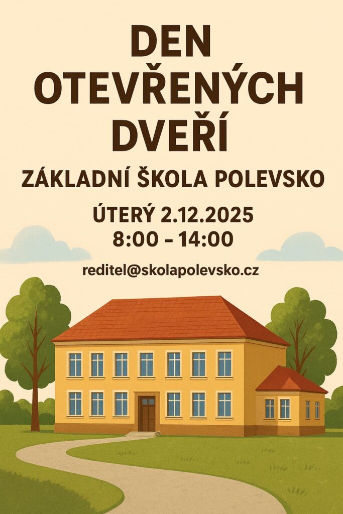 Milí rodiče a přátelé školy,srdečně vás zveme na Den otevřených dveří v ZŠ a MŠ Polevsko, který se uskuteční v úterý 2. 12. 2025 od 8:00 do 14:00. Během dne budete mít možnost: Budeme moc rádi, když se přijdete podívat, jak to u nás funguje. V případě dotazů nás můžete kontaktovat:📧 reditel@skolapolevsko.cz Těšíme se na vás!